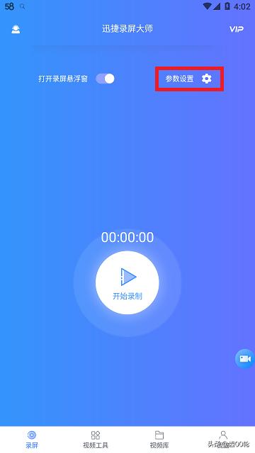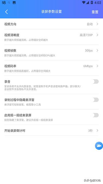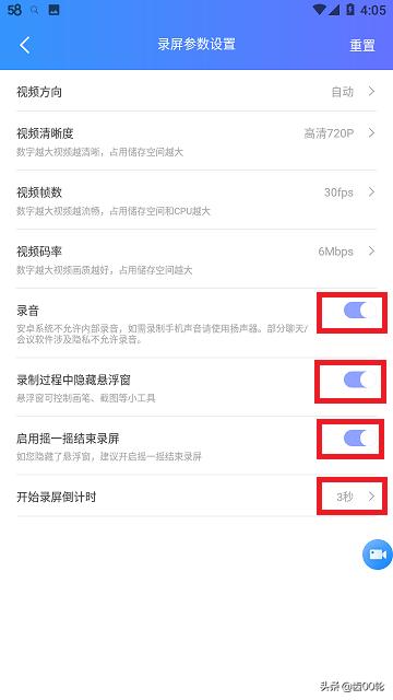 3、【参数设置】里还可以设置在录制过程中是否需要录音、录制过程是否需要隐藏浮窗、是否摇一摇结束录制、开始录制倒计时需要多久,在相应的选项后面打开或者关闭选项开关、设置时间就可以实现。