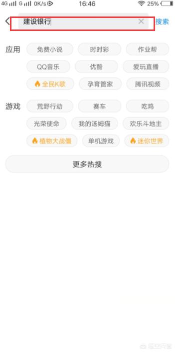 2、点击搜索栏,搜索“建设银行”。如下图所示。