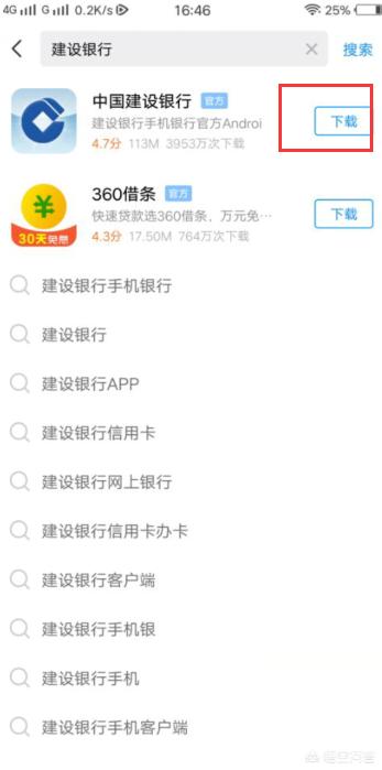 3、出行建设银行APP,点击“下载”并安装。如下图所示。